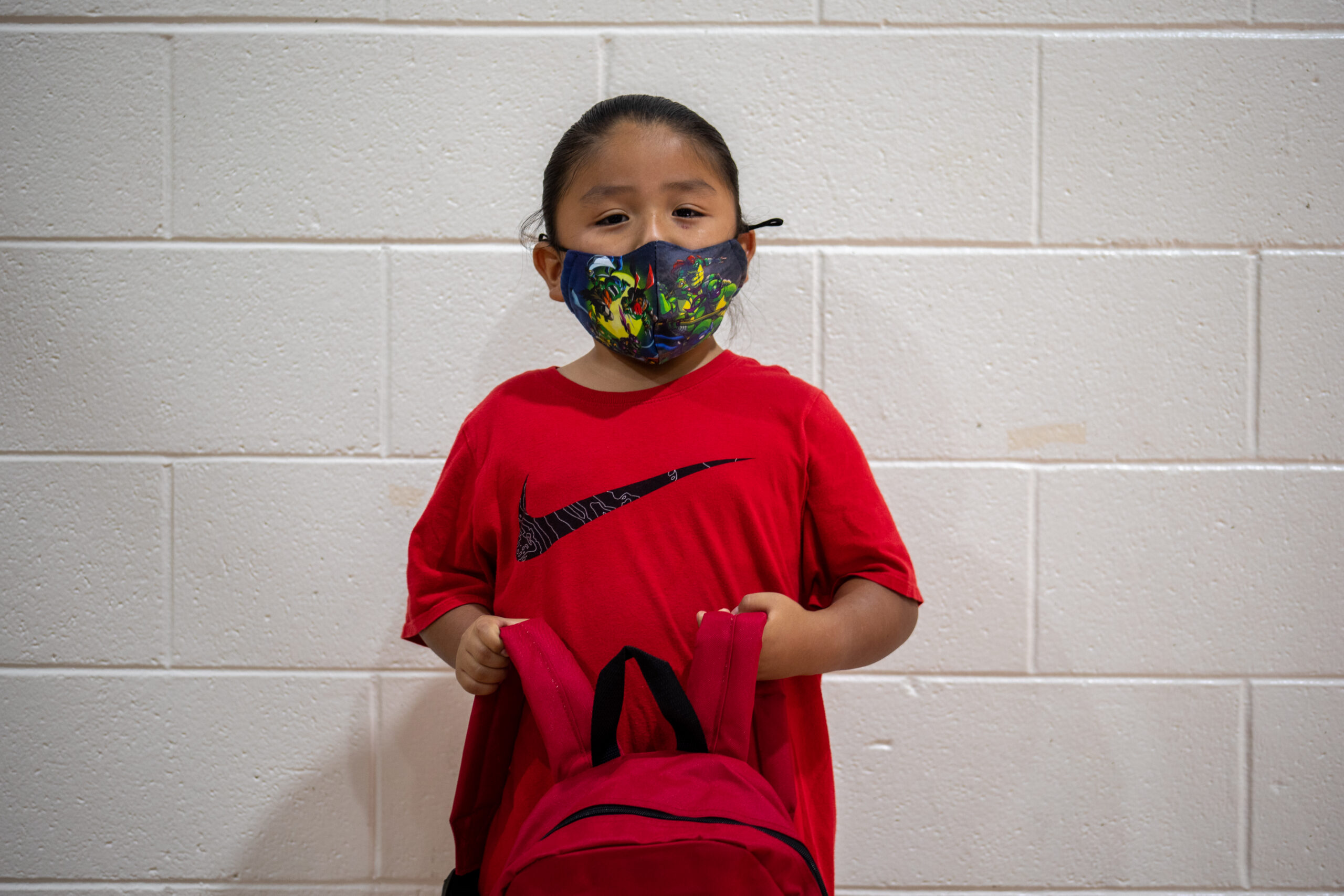 A child wearing a colorful mask and red shirt holds a matching red backpack in front of a white brick wall.
