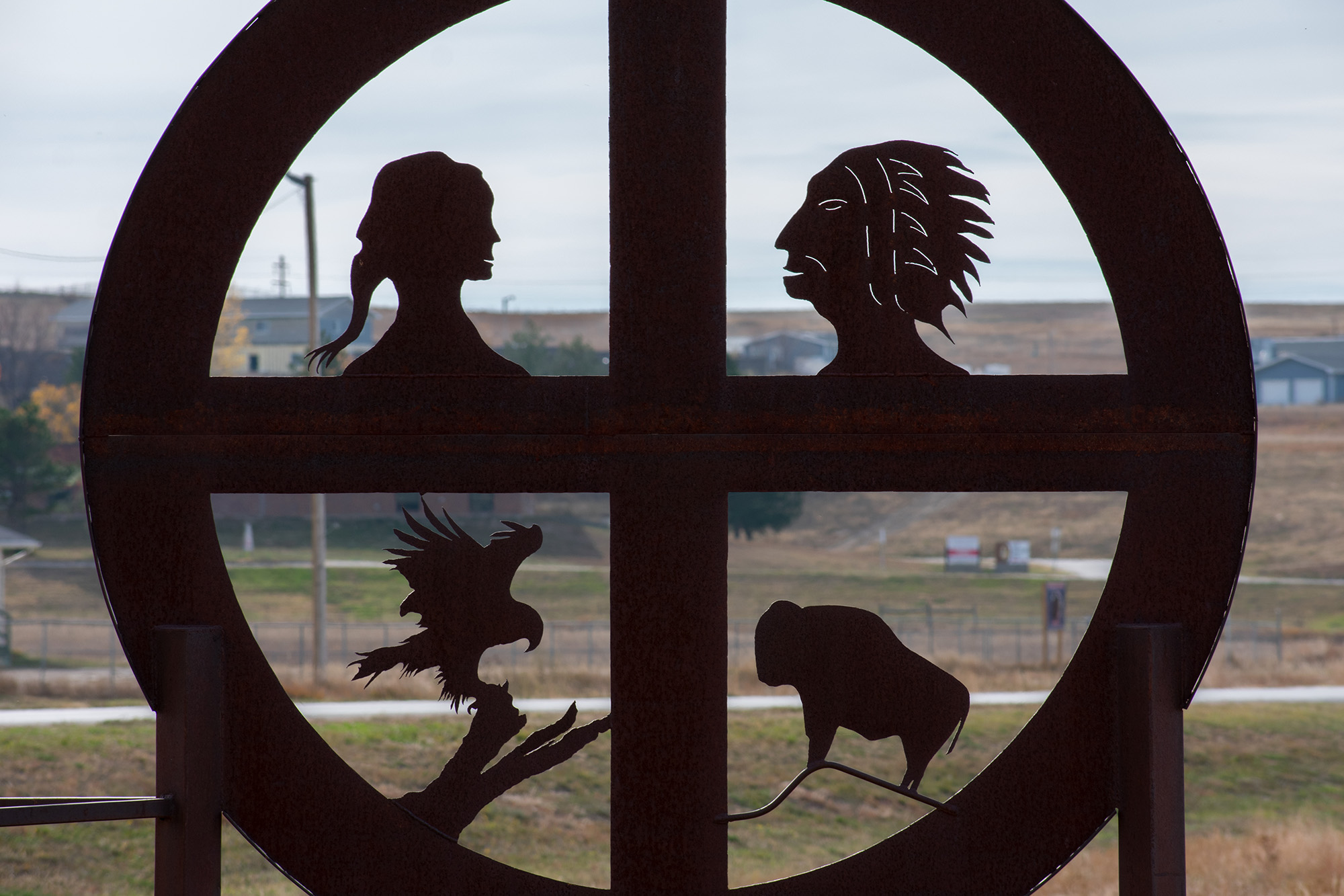 A circular metal sculpture features silhouettes of a woman, a man in a headdress, an eagle, and a bison against a rural backdrop.